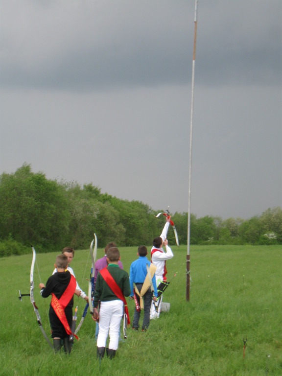 C'est sous un beau soleil, qu'avait débuté le tir du Roitelet de FRANCE avec Alexis ROUSSET, qui a admirablement représenté le club des archers du Perche pour sa première participation, en touchant une fois l'oiseau sur son mât. Beaucoup de ses flèches ont frôlé l'oiseau sans l'abattre. Bravo à ce jeune archer méritant. Au cours de la journée, le temps est devenu très maussade. Une mini-tempête s'est levée d'un coup, juste avant le début des tirs avec un vent tellement violent que l'oiseau se retrouvait d'après pas mal d'archers avec un porte à faux de plus de quatre mètres par rapport à l'aplomb du mât. Les organisateurs ont dû se résoudre à tout démonter pour éviter la casse, et attendre un semblant d'accalmie. C'est ainsi qu'ensuite, j'ai pu tirer ce tir traditionnel et prestigieux avec un vent moyen et sous des trombes d'eaux... Je suis très content malgré cette météo capricieuse d'avoir tiré pas mal de belles flèches volant très près mais sans le succès escompté. Tant pis je reviendrai toujours aussi motivé et sûrement sous un très beau soleil.
